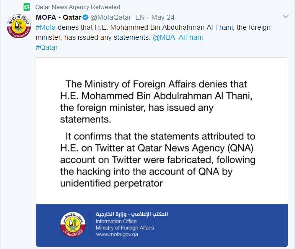 海湾国家的媒体当晚相继报道这则“大新闻”,从报道中得知这件事的卡塔尔人吃了一惊。第二天,卡塔尔政府通讯办公室主任表示,卡塔尔新闻社的网站“遭到了不明实体的黑客入侵”,“一份被归于本国埃米尔谢赫塔米姆·本·哈马德·艾勒萨尼殿下的假声明被刊发了出来”。