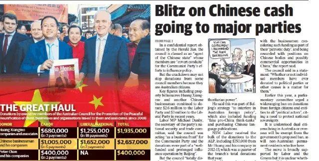 其实在过去这2、3年里,澳洲华裔商人黄向墨等知名华侨就多次遭到了这样的抹黑。去年,《先驱太阳报》竟在9月这短短一个月里连续放出数篇文章,暗示早已在澳洲生活和工作多年的黄先生是中国政府派来“干涉澳洲政治”的“间谍”,理由仅仅是他的一些生意在中国、和中国一些官员有过接触,以及他在资助一些澳洲的政客和政党参加竞选,却根本没有证明这三者之间存在任何关联的证据。