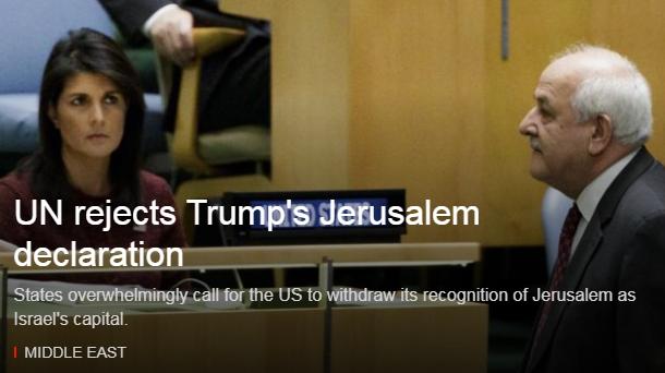 联合国大会当天召开紧急特别会议,就有关耶路撒冷地位问题的决议草案进行投票表决,以128票赞成、9票反对、35票弃权的结果通过决议。决议要求以色列和巴勒斯坦通过谈判决定耶路撒冷的地位。
