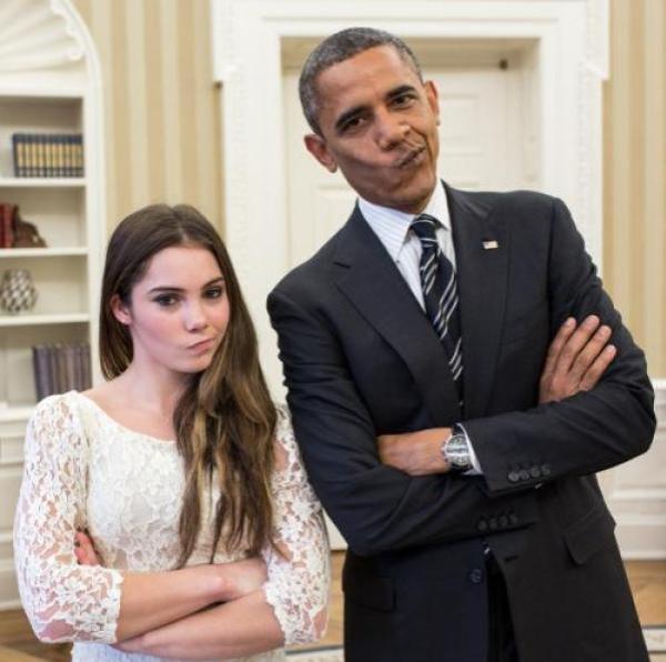 马罗尼(左)外号“不爽姐”。拜会白宫时,她曾和奥巴马一起摆出经典造型。