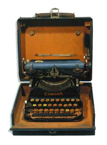 一台打字机,小巧别致,略有残破,机身固定在黑色皮纸包裹的木盒内,合起来如同一只微型手提箱,打开箱盖则能立即进入工作模式。这台打字机牌子为“CORO-NA”,曾被李大钊使用过。