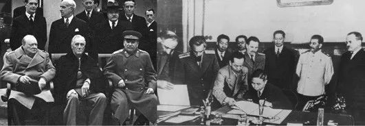 ◆1945年雅尔塔会议上的三巨头:丘吉尔、罗斯福与斯大林(左图)。此后国民党政府依据雅尔塔协定的框架原则,与苏联政府签订了严重损害中国主权和利益的《中苏友好同盟条约》和协定(右图)。