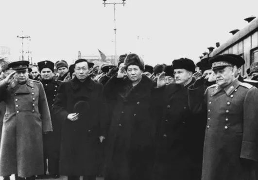 ◆1949年12月16日,毛泽东访问苏联在抵达莫斯科车站时,受到苏联党政领导人布尔加宁(右一)、莫洛托夫(右二)等的热烈欢迎。
