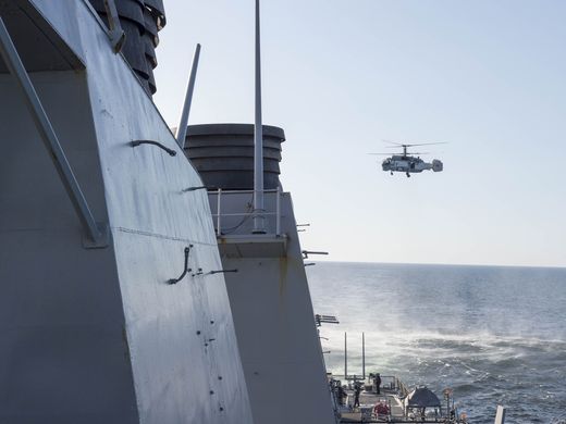 俄卡-27直升机贴近美舰拍照