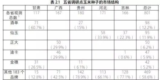当下尽管玉米品种繁杂,全国有数以千计种(佟屏亚,2014),在我们的样本中,五省调研点的农户使用的玉米种子品牌达到188个。但是,从我们调查数据分析中来看(见表2.1),在农户使用的种子品牌【match1】中,“酒单”、“先玉”【2】、“正大”、“迪卡”、“金穗”5个品种就占了所调查样本量的41.4%。上述 5个玉米品种各自分别占特定省份调查样本量的 20%以上。