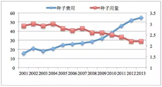 图 2.2 2001-2013年全国玉米种子平均亩成本及亩用量