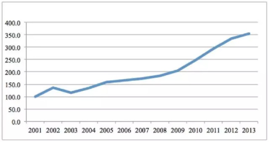 事实上,如果以2001年每亩玉米种子成本为基础点(100%)计算2002-2013年这项成本的增幅,可以发现,每亩种子成本的增幅在2001年到2009年不到十年的时间里就翻了一倍,2009年以后增幅更是进一步提升,到2013年时,每亩玉米种子的成本相比2001年已经上涨了2.5倍(见图2.3)。正如上一节河北先玉335带动种业高价位的案例说明, 玉米种子的价格飙升和不断更新换代背后,是种子公司在市场竞争下不断推陈出新以占据市场份额,同时,种子企业追逐利润的方式也在不断更新。