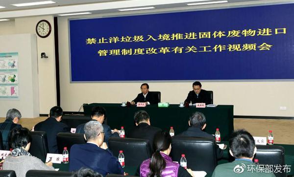 禁止洋垃圾入境推进固体废物进口管理制度改革工作视频会议现场。 @环保部发布 图