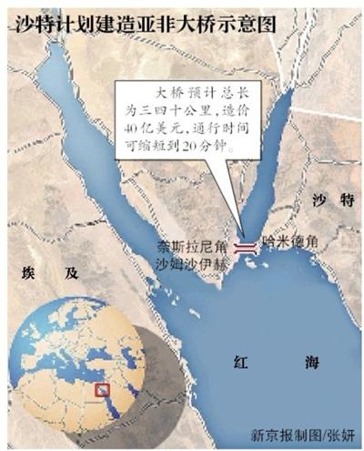萨勒曼8日在开罗宣布:“我与我的兄弟、尊敬的(埃及)总统阿卜杜勒—法塔赫·塞西同意建造一座大桥,把两个国家连接起来。”按照设想,这座大桥将横跨红海蒂朗海峡,两端分别位于埃及西奈半岛靠近旅游胜地沙姆沙伊赫的奈斯拉尼角、沙特西北部的哈米德角,预计大桥总长为三四十公里,将使两国之间的“通勤”时间缩短到20分钟。