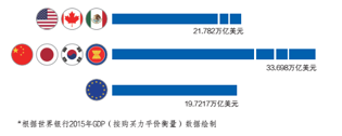 2015年,欧盟28国经济总量占世界的25%,成为世界重要的一极;北美经济圈包括美、加、墨,占世界经济总量的26%;东亚国家通过十年整合,初步形成了东亚经济圈,内部贸易量从44%上升到55%,经济总量占到世界的24%。这三个经济圈占到世界经济的75%,共同进入了门槛条件为20万亿美元规模的洲域共同体俱乐部。