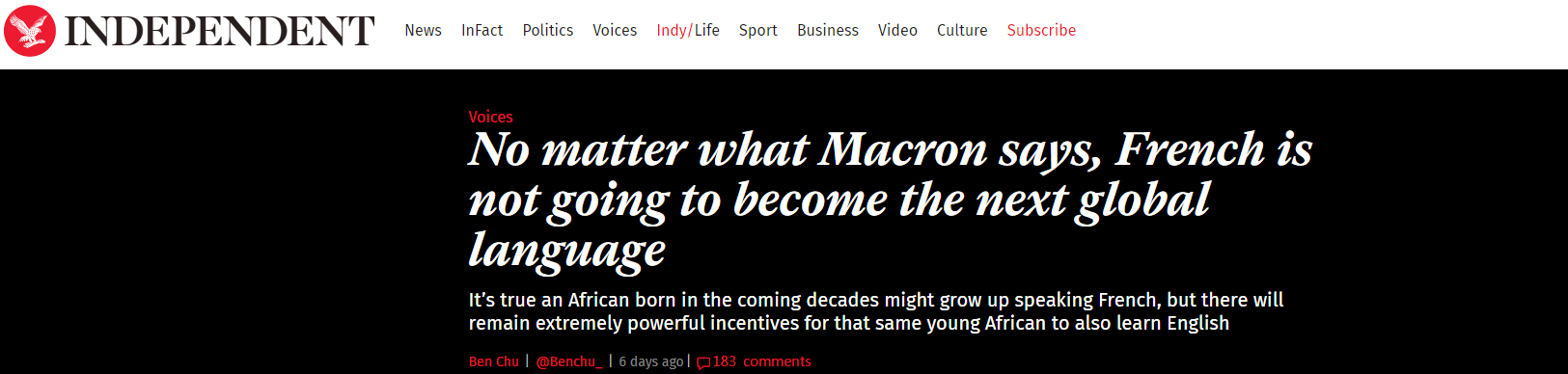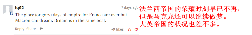 这不,英国《独立报》先后发表了《马克龙说法语将成世界第一语言》、《无论马克龙说的多好听,法语都不可能成为下一个世界性语言》两篇文章,在评论区,英国网友们开启了群嘲模式。