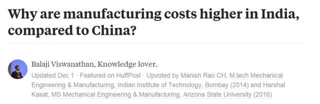不过,虽然得到总理的认可,这位机器人公司的CEO却并不“安分”。几天前,当他在美国著名问答网站Quora.com上看到一个关于“为啥印度制造业的成本要比中国高”的问题时,他当即就奋笔疾书,写下了一篇对比中印两国差距的文章。