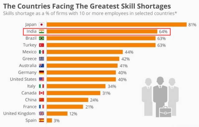 ▲图为劳工短缺问题最严重的部分国家,其中印度排第二