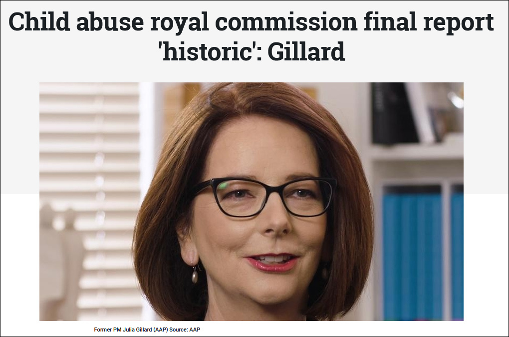 曾在5年前设立皇家委员会调查的澳大利亚时任总理吉拉德(Julia Gillard)对委员会成员及经历过不幸的人表达了感谢,称他们为正义和儿童的未来进行了艰苦的战斗。
