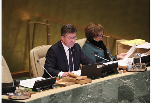 12月21日,在位于纽约的联合国总部,第72届联合国大会主席莱恰克(左)主持联合国大会紧急会议。联合国大会21日以压倒性多数投票通过一项决议,认定任何宣称改变耶路撒冷地位的决定和行动“无效”。