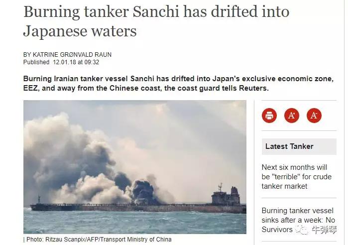 比如,下面这张图片,表述就更明确了,日本海警这样告诉路透社记者:燃烧的“桑吉”号油轮,现在已经漂离了中国沿海,漂到了日本“专属经济区”(Japan's exclusive economic zone)。