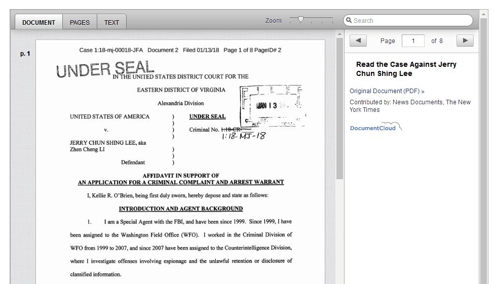 美国司法部表示,2012年,杰里同家人从香港前往弗吉尼亚州和夏威夷旅行时,联邦调查局搜查了他的宾馆房间,在他的旅行箱里有一个密封的塑料旅行袋,打开后有两本小书,上面手写着机密信息,如,雇佣间谍和秘密中情局员工的真实姓名。