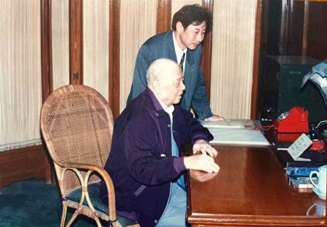“张耀祠对我讲:就在这里,毛泽东题写‘向雷锋同志学习’。”毛卓与张耀祠于中南海丰泽园合影。(照片由毛卓提供。)