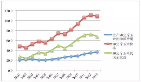 吉林省调查点玉米种植成本的上涨,在全国数据中也有类似的呈现。根据《全国农产品成本收益资料汇编》的统计数据,从2001年到 2013年,玉米种植的各项成本都在不同程度地上涨。图2.1呈现了每50公斤玉米的物质费用、出售价格和现金收益。从图中可以看到,从2005年开始——也就是中国正式加入WTO的第 5年,种植玉米的物质费用【5】便持续上涨;而玉米价格和玉米收益却出现一些波动,且即便如2005、2008年的数据所显示,在玉米价格和收益都有所下降的情况下,种植玉米的物质费用仍然在上涨,这一趋势在2012-2013年再次出现。这种状况暗示着,尽管国家的最低收购价的确起到了保障农民收入的作用,然而这种保护作用正在不断受到农资成本上涨的冲击。
