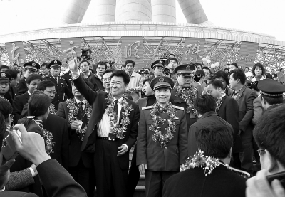 神舟五号发射成功,载人航天事迹报告团受到上海人民热烈欢迎。